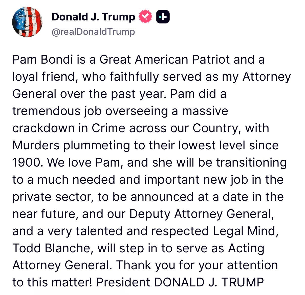In a statement posted publicly, Trump praised Bondi’s tenure, calling her a “great American patriot” who “did a tremendous job” leading a crackdown on crime.